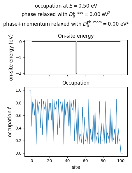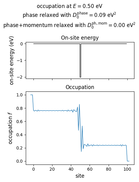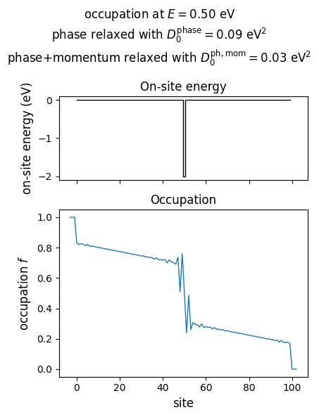 plot_onsite_and_occupation(E_to_plot, D0_phase, D0_phase_momentum, N_sc)
