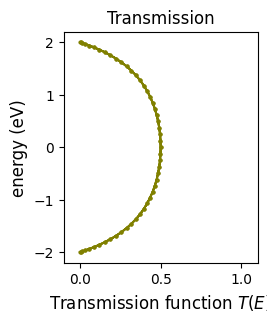 reduces the transmission from the clean limit \(T(E) = 1.0\) to (at most) half of that value \(T(E=0.0) = 0.5\):